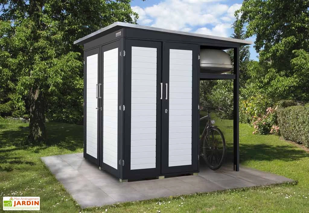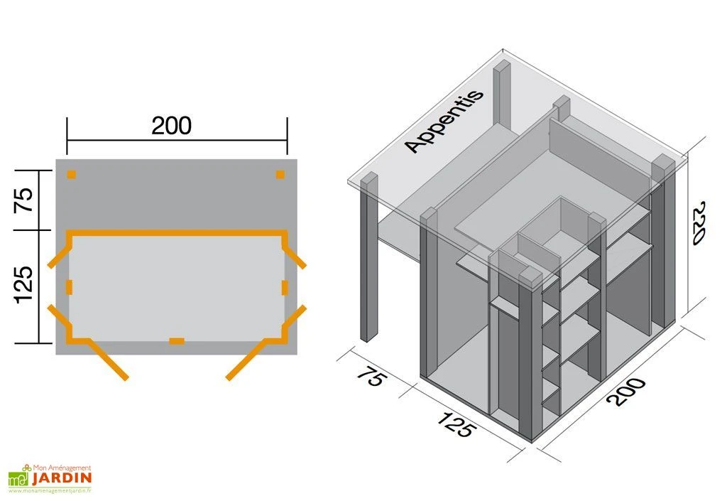 Les dimensions de l’abri de jardin sont : 2 x 2 x 2,17 m (l,l,h) en tout dont un appentis de 75 x 200 cm (l,l) qui vous permettra de placer deux vélos. Le toit de l’abri est monopente, vous pourrez le monter avec la pente à l’avant ou à l’arrière selon vos envies. L’étanchéité du coffre de rangement est réalisée par un revêtement de toit auto-adhésif qui protège votre abri des intempéries et des rayons UV.