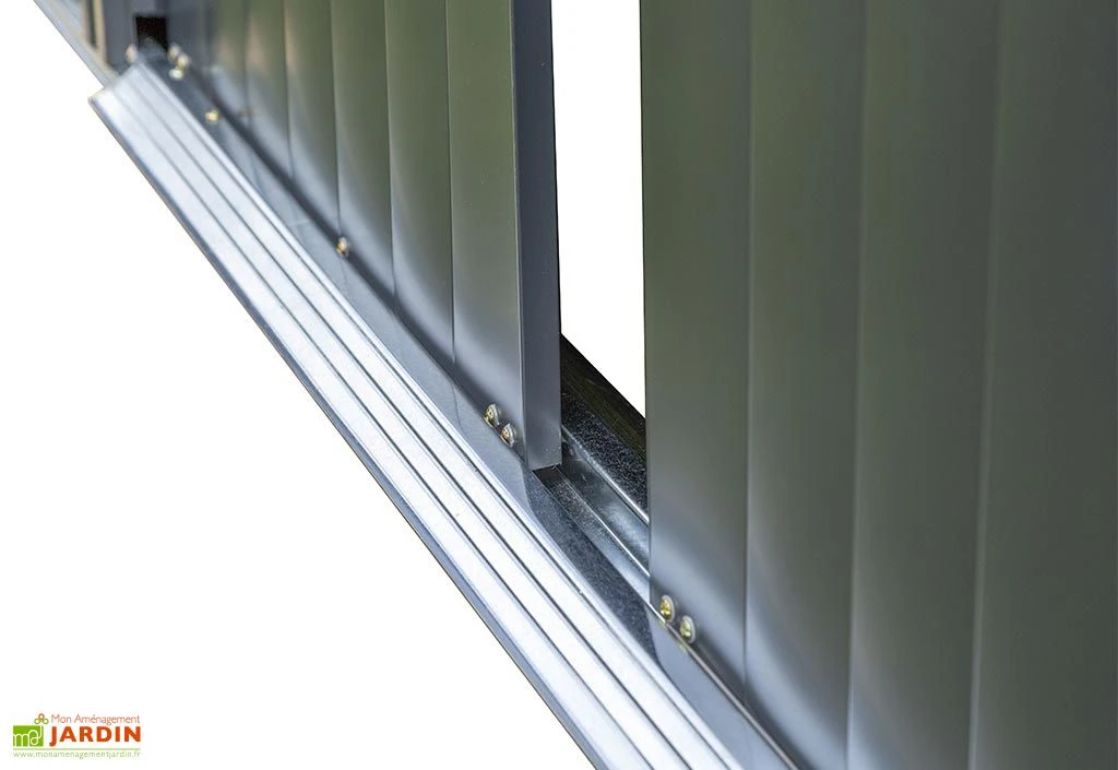 Ce cabanon de jardin en métal Spacemaker offre un bel espace intérieur de 8,5 m² dans lequel vous pourrez ranger du mobilier de jardin, des outils ou du matériel de jardinage à l’abri des intempéries et du vol. Il mesure 3,13 m de large sur 2,97 m de profondeur pour 1,98 m de haut et occupera une surface de 9,2 m² dans votre jardin. A noter, la présence d’une double porte coulissante de 141 x 165 cm par laquelle vous pourrez pénétrer aisément à l’intérieur de l’abri.