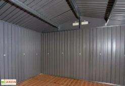 L’abri de jardin en acier galvanisé est recouvert d’une peinture gris clair, RAL 9006. L’acier est galvanisé à chaud, et offre une excellente résistance face à la corrosion, la galvanisation à chaud étant plus efficace que la galvanisation classique. Il ne demande ainsi aucun entretien et garde le même aspect pendant longtemps.