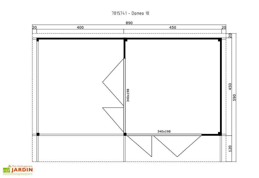 - Dimensions hors tout : 590 x 890 cm soit 52,51 m²