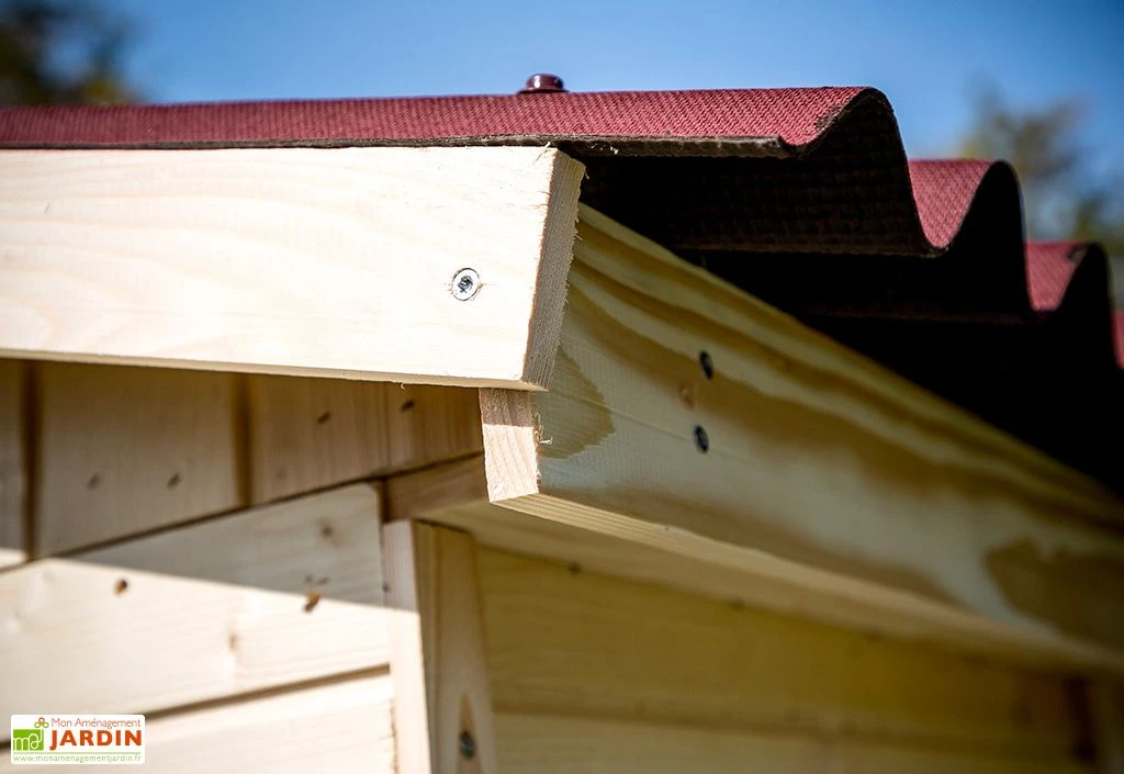 Composées de panneaux de 16 mm d’épaisseur, les cloisons de cette cabane de jardin sont surmontées d’un toit à deux pans dont la couverture est faite de plaques ondulées bitumées. Une double porte de 160 x 170 cm, avec lucarnes, vous permettra d’accéder facilement à l’intérieur de l’abri, même avec du matériel relativement encombrant.