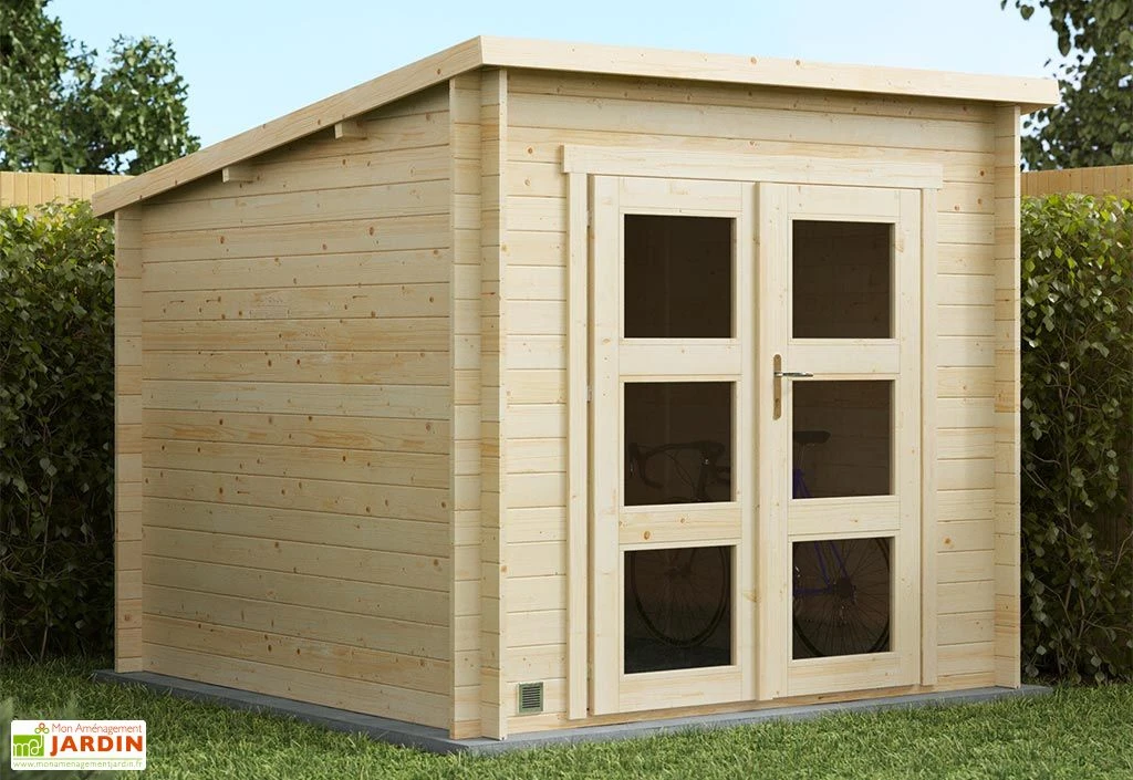 L’abri mesure 2,38 x 2,48 x h. 2,18 m pour une surface extérieure de 5,9 m². Les voliges sont en bois massif afin d’assurer la solidité du chalet. Elles sont recouvertes de feutre bitumeux pour assurer l’étanchéité de l’abri.