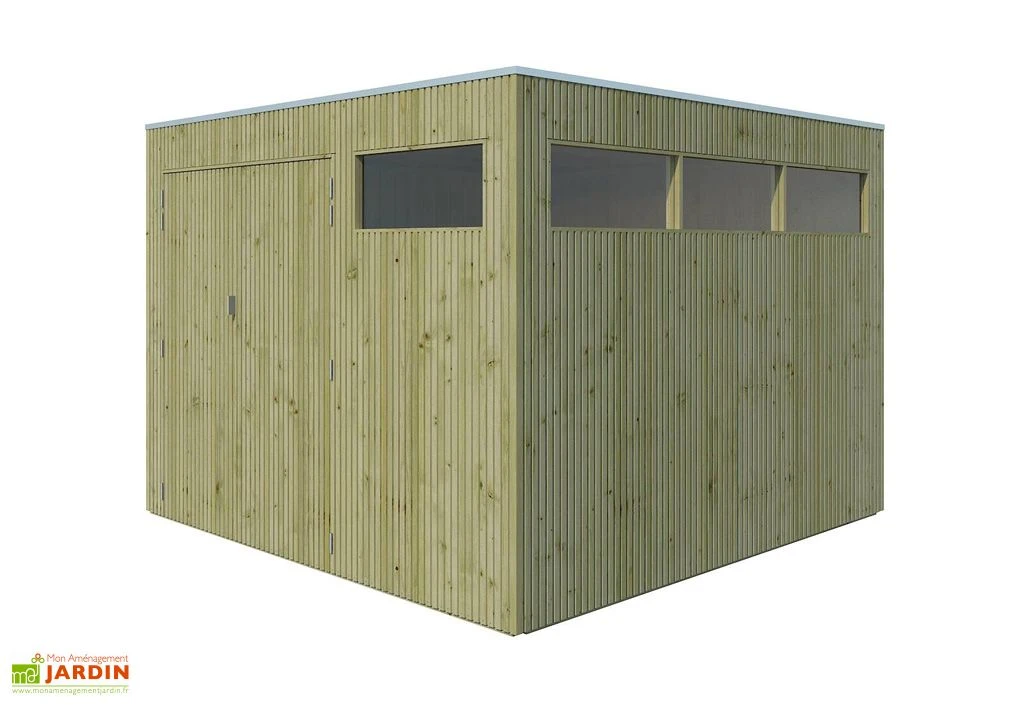 Ce cabanon carré mesure 2,98 x 2,98 m au sol, offrant une surface extérieure de 8,88 m². Ses dimensions intérieures de 2,84 x 2,84 m permettent un espace de stockage confortable de 8,07 m². Située à une hauteur de 2,20 m, sa toiture en OSB3 recouverte d’EPDM assure une étanchéité performante, tout en garantissant l’évacuation des eaux grâce à sa pente de toit de 1°.