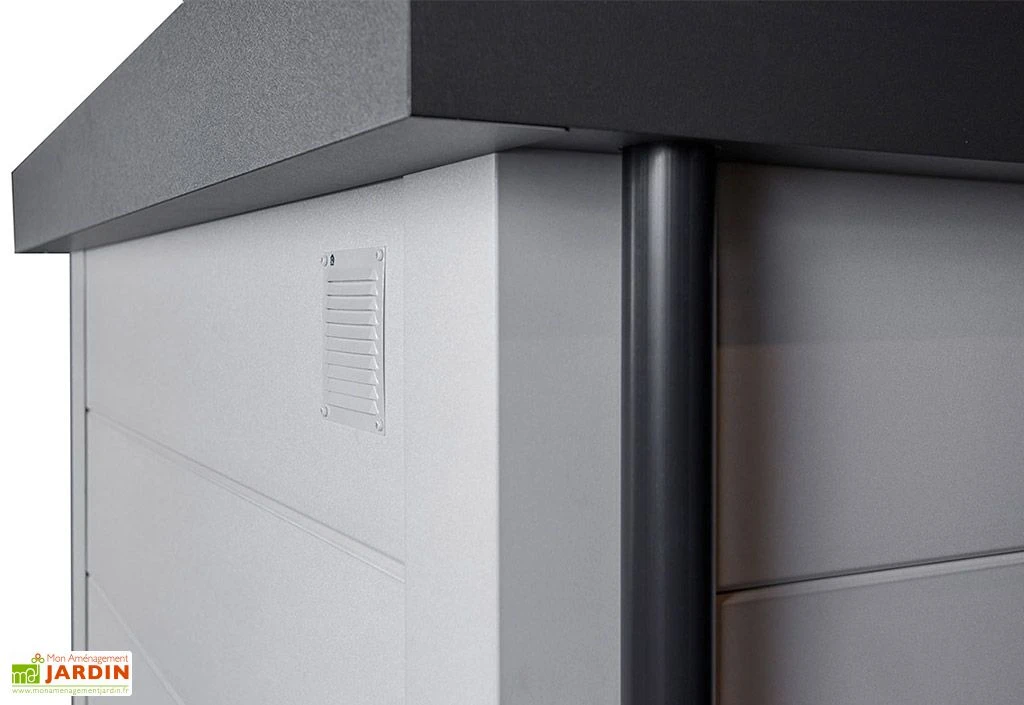 Les parois de cette remise de jardin intègrent des aérations pensées pour éviter le développement de moisissures à l’intérieur et supportent une toiture plate (inclinaison du toit : 2°) composée de panneaux sandwich isolés de 4 cm d’épaisseur. Cette dernière est pourvue d’une gouttière avec descente, pour une évacuation efficace des eaux pluviales pendant une averse. Un plancher en métal est par ailleurs proposé dans l’onglet « Accessoires » si vous souhaitez mieux isoler l’abri de l’humidité émanant du sol ou de la boue.