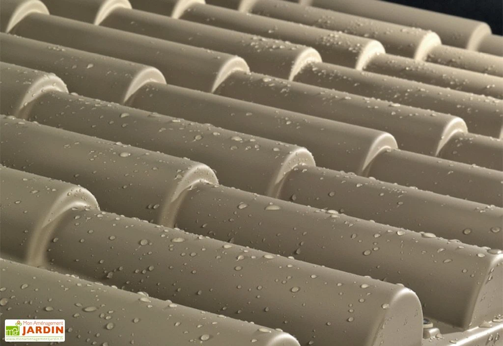 L’abri de jardin Evo 100 de chez Garofalo est fabriqué en Italie. Il est en PVC et ABS (plastique résistant aux chocs). Les parois sont composées de lames alvéolées en PVC de 20 mm d’épaisseur beige. Le toit en ABS monopente, d’un seul bloc, est traité anti UV. Il possède des reliefs imitation tuiles de couleur marron.