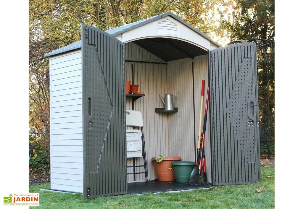 Votre abri en polyéthylène haute densité est livré avec son plancher anti-dérapant. Il est équipé d’un puits de lumière pour apporter de la luminosité dans l’abri. Sa porte double mesure 1,32 x 1,98 m (l,h).