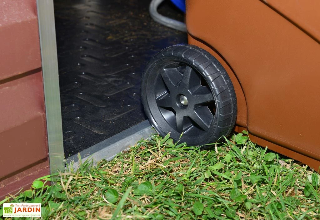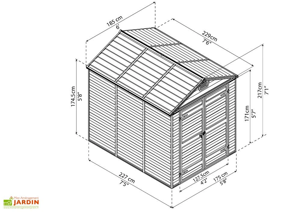 Pour éviter la condensation à l’intérieur de l’abri de jardin, une bouche d’aération est située en haut de la façade avant. Ses dimensions intérieures sont de 2,23 x 1,71 x 2,08 m (l,l,h) pour une capacité de stockage de 7,5 m3. Les dimensions extérieures sont de 2,29 x 1,85 x 2,17 m (l,l,h).