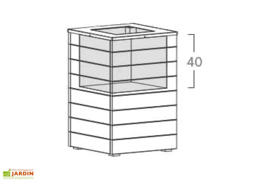 Votre bac à fleurs Selekt de chez Jardipolys est carré. Il a été fabriqué en France. Ses dimensions hors tout sont de 45 x 45 cm (longueur, largeur) pour une hauteur de 47,5 cm, ce qui lui donne des dimensions intérieures de 40,8 x 40,8 cm (longueur, largeur), pour 40 cm de hauteur. Les lames en bois présentes sur chaque face mesurent 9,5 cm de long et les 4 montants affichent des dimensions de 45 x 45 cm.