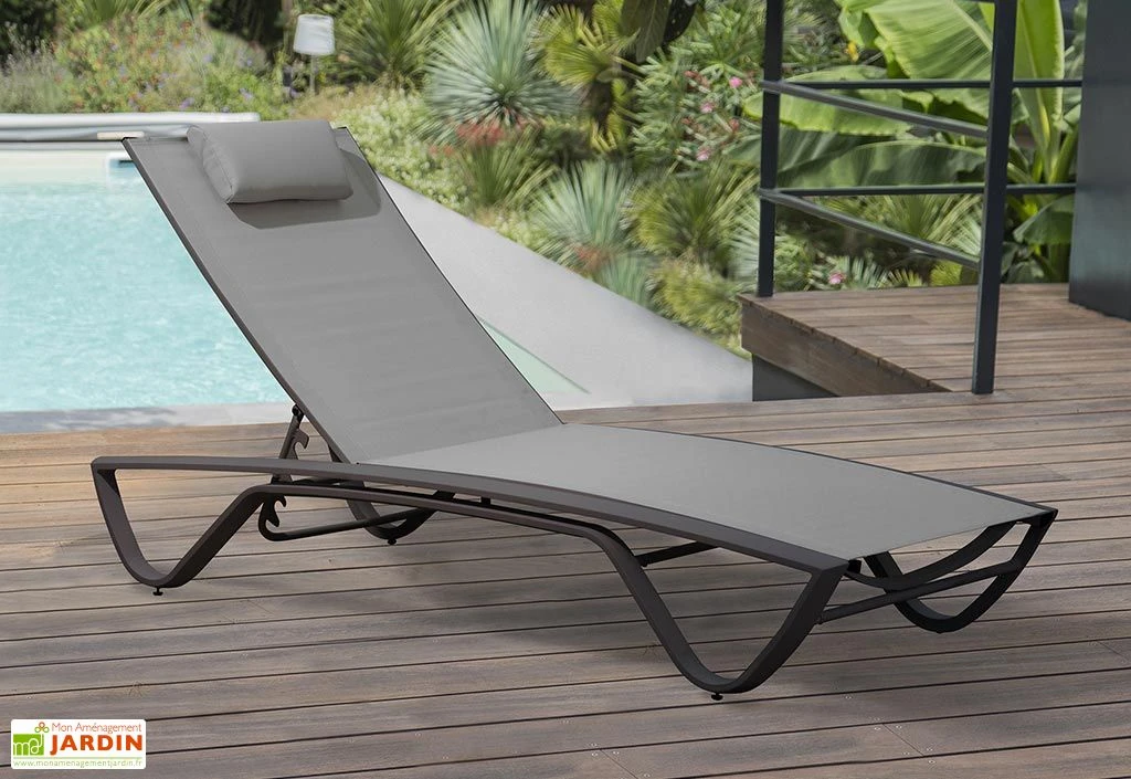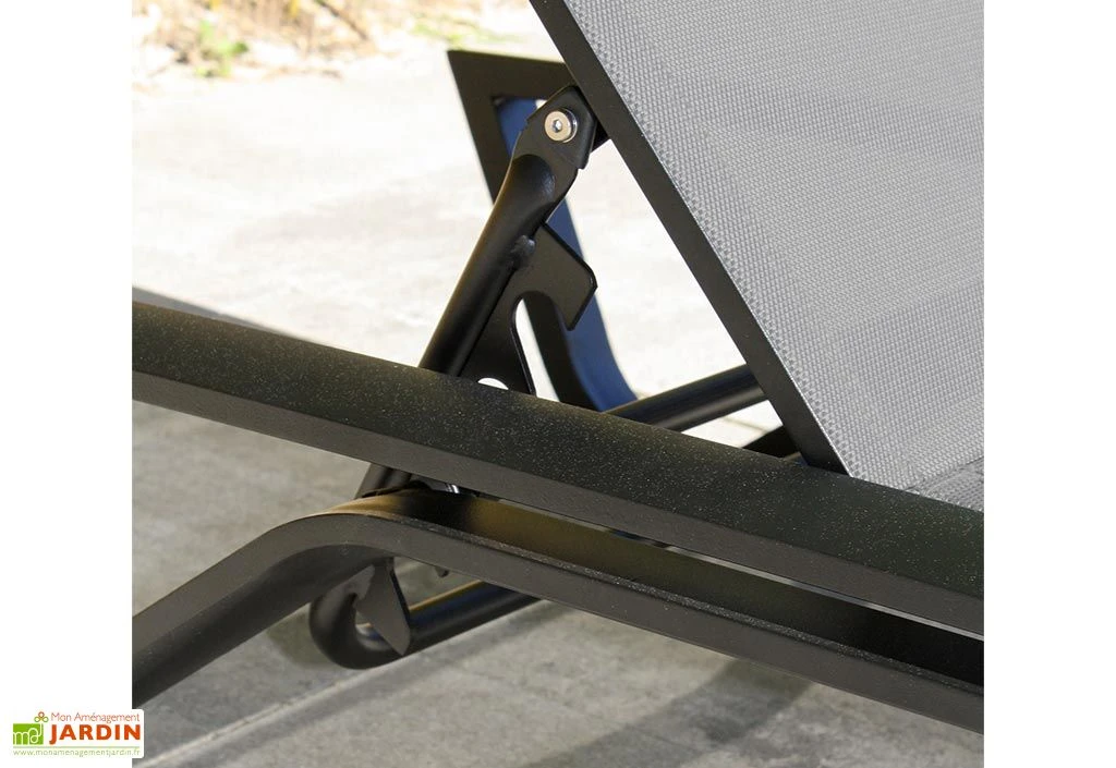 Cette chaise longue de jardin est disponible en noir, en blanc, et en gris.
