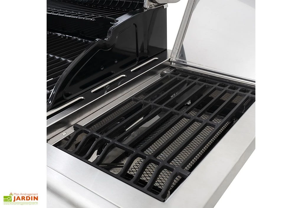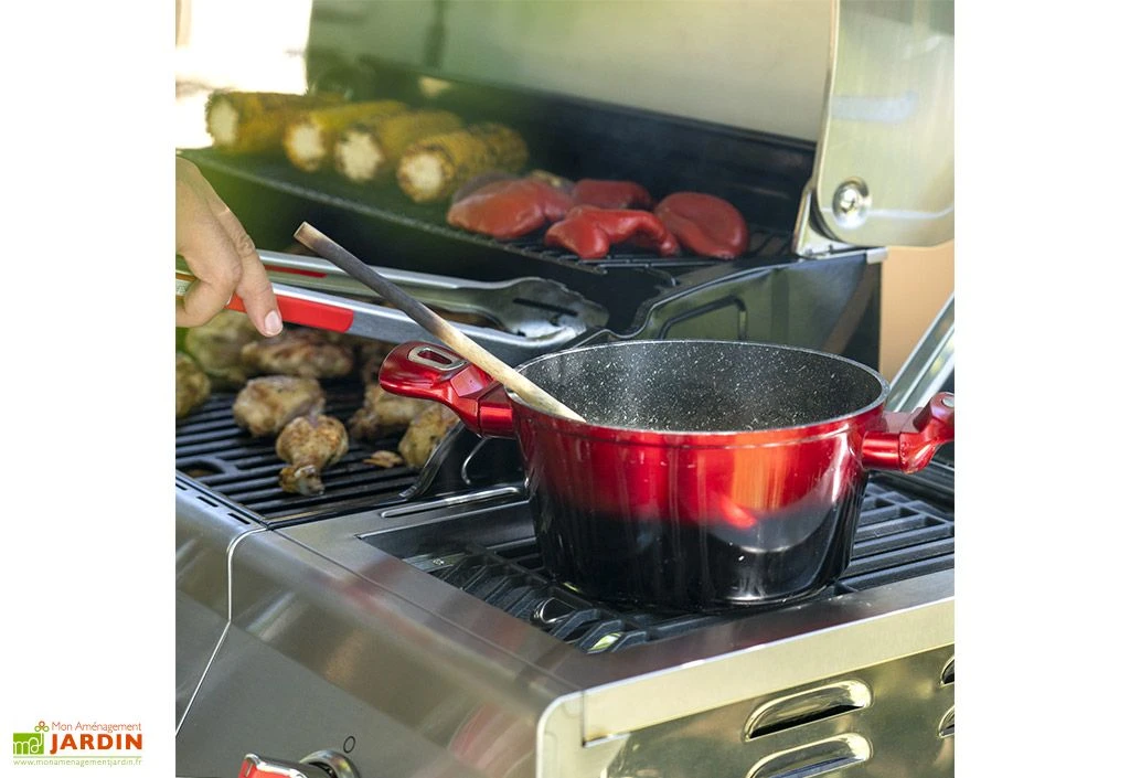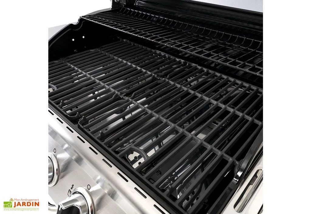 Parfait pour les journées ensoleillées ou les soirées d’été, ce barbecue au gaz trouvera une place de choix sur votre terrasse ou dans votre jardin. Très performant, il dispose d’un allumage électronique à pile offrant une mise en marche facile et rapide. L’appareil de cuisson est équipé de 5 brûleurs en acier inoxydable de 3,2 kWh et d’un brûleur latéral de haute puissance de 4,4 kWh. Au total, le barbecue bénéficie d’une puissance de 20,5 kWh.