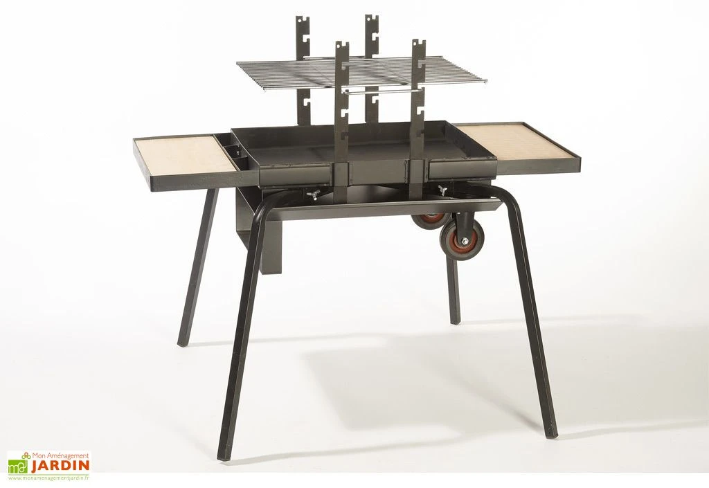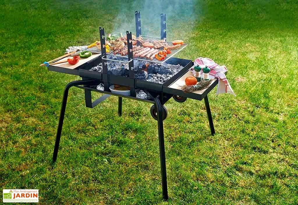 Il est équipé deux tablettes de 0,45 x 0,21 m (l,l) et de 4 pieds amovibles pour une utilisation aussi bien au sol que sur pieds. Une large grille de 57,5 x 39,5 cm portée par 4 crémaillères et réglable sur 6 niveaux vous permet d’assurer le repas de 20 à 30 personnes.