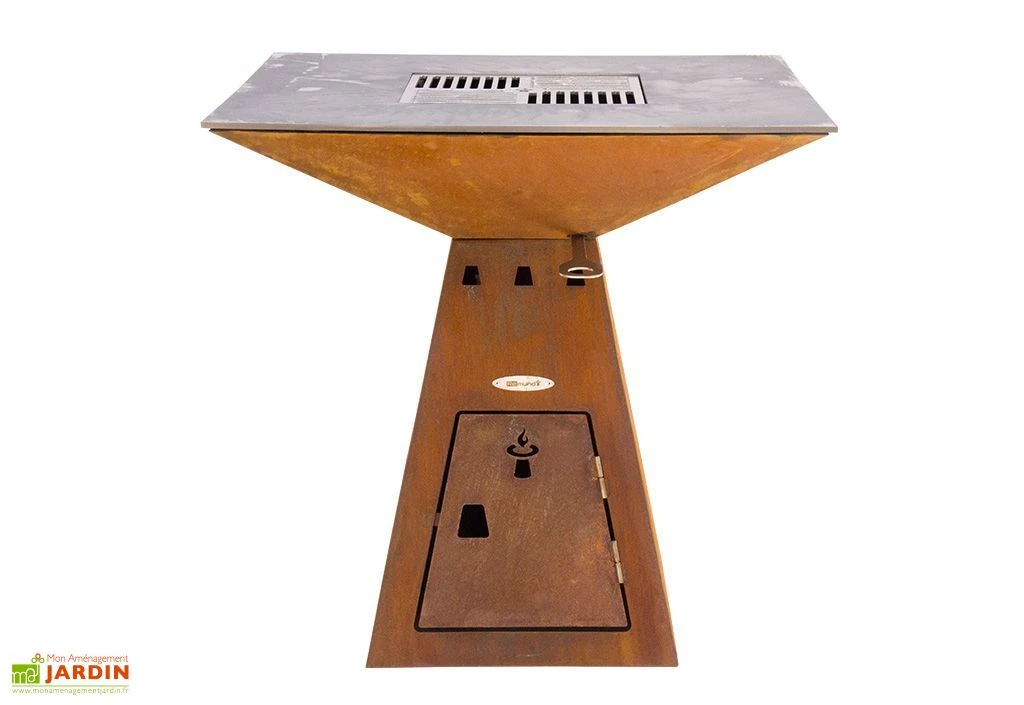 Le corps en acier du braséro est travaillé de façon artisanale et son oxydation volontaire permet de lui offrir un look vintage et vieilli sans pour autant altérer sa solidité. La plaque de cuisson et la grille sont, quant à elles, en inox pour griller vos aliments en toute sécurité. Il n’existe ainsi aucun risque de dépôt de rouille sur les grillades. Le récupérateur de cendre se trouve derrière la trappe de visite. Il est accessible facilement pour une manipulation aisée.