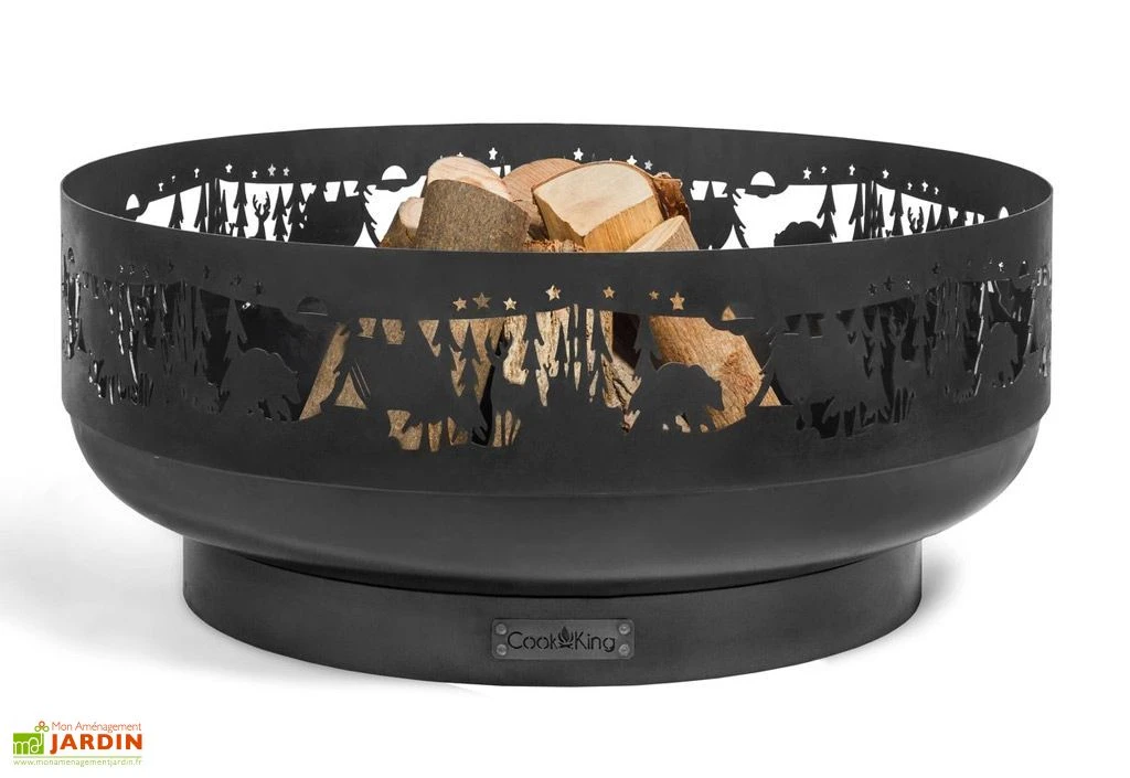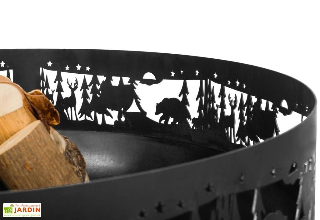 Le braséro Forest de Cookking est fabriqué à la main, en acier brut. Il mesure 80 cm de diamètre et 33 cm de hauteur et possède une jolie frise illustrant parfaitement la forêt de l’Amérique du Nord. La frise a été réalisée à l’aide d’un laser à commande numérique, permettant de belles finitions et des détails précis.