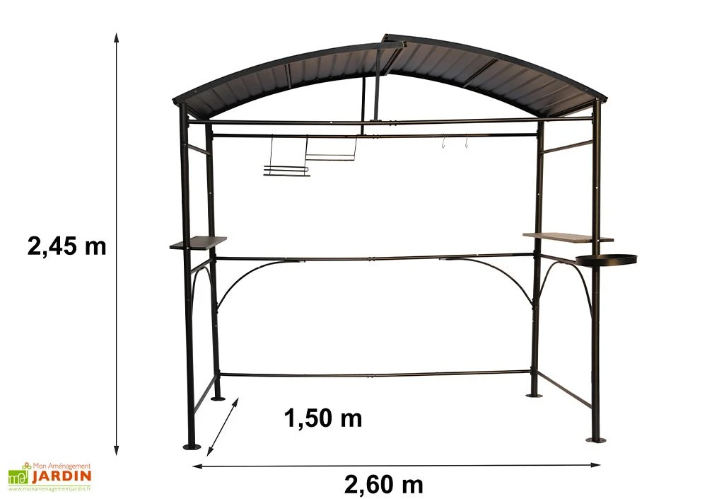 L’abri pour barbecue de chez Habrita offre un grand espace de protection et peut abriter aussi bien un petit barbecue qu’un vrai piano d’extérieur. Il est constitué d’une armature en acier époxy de 0,8 mm d’épaisseur et d’une double toiture en acier inoxydable galvanisé de 0,5 mm d’épaisseur. Ses dimensions totales sont de 150 cm de longueur pour 260 cm de largeur et 245 cm de hauteur.