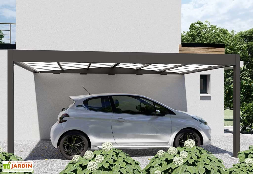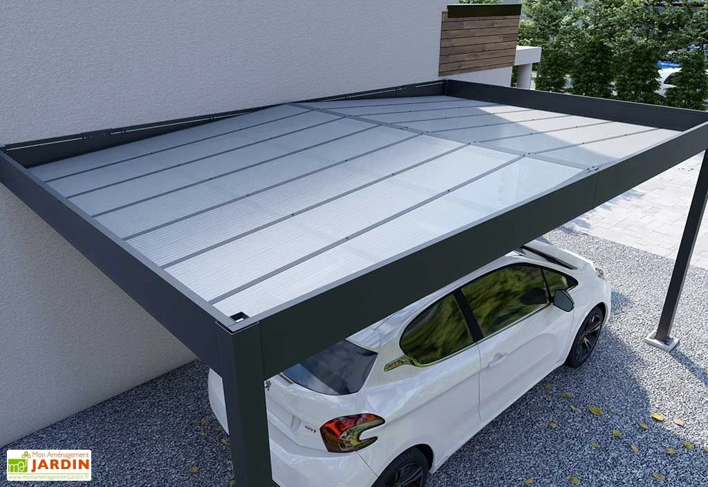 Le carport mural Libeccio de chez Trigano est doté d’une solide structure en aluminium gris anthracite, une finition élégante qui facilitera son intégration dans votre extérieur. Robuste et insensible à la corrosion, l’aluminium est un matériau qui ne demande ni traitement, ni entretien particulier. Il s’agit également d’un métal plutôt léger, ce qui facilitera la manipulation des différentes pièces qui composent le carport au moment de son montage. Cet abri pour voiture est en effet livré en kit et devra être monté par vos soins (visserie inox et ancrage inclus).