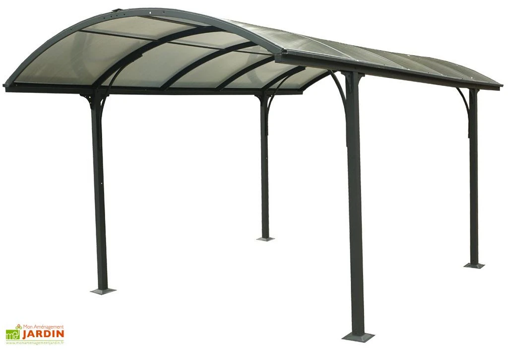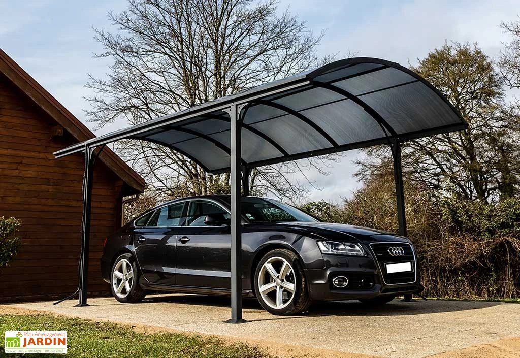 La toiture translucide foncée du carport est arrondie. Elle est composée de 10 plaques de polycarbonate de 6 mm d’épaisseur dernière génération, qui laisse passer la lumière tout en réduisant la chaleur et les UV. Le carport permet de protéger votre voiture ou vos motos des UV et des intempéries. Ce carport n’est pas adapté pour une altitude de plus de 500 m et nécessite d’être déneigé régulièrement en cas de chute de neige supérieure à 10 cm. La toiture est équipée de gouttières latérales. Une bâche de protection pour carport est disponible dans la rubrique « Accessoires ».