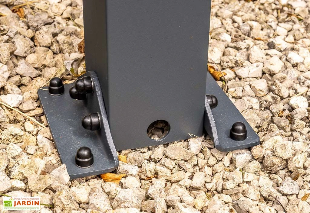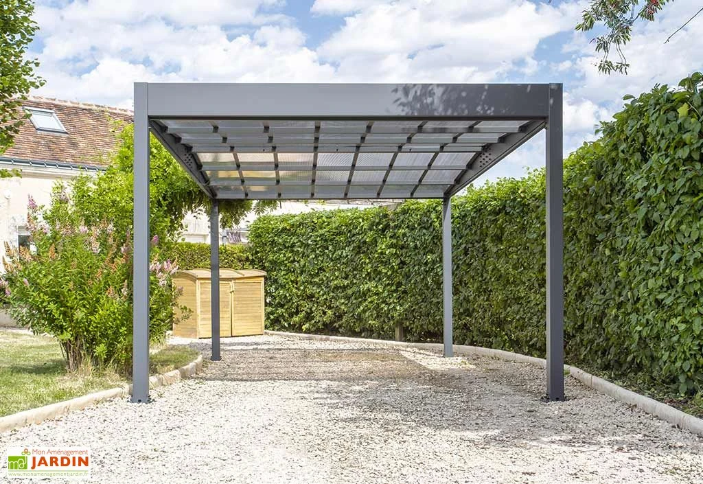 Ce carport offre une largeur et une hauteur de passage de 2,96 m et 2,10 m. Il accueillera donc aisément une voiture qui, une fois stationnée, ne craindra ni les intempéries, ni les rayons UV. Sa solide structure est en effet pensée pour résister à des vents pouvant atteindre les 150 km/h tandis que sa couverture affrontera sans problème la pluie, la grêle et la neige. Ses quatre pieds de 10 x 10 cm intègrent même un système facilitant l’évacuation de l’eau de pluie.