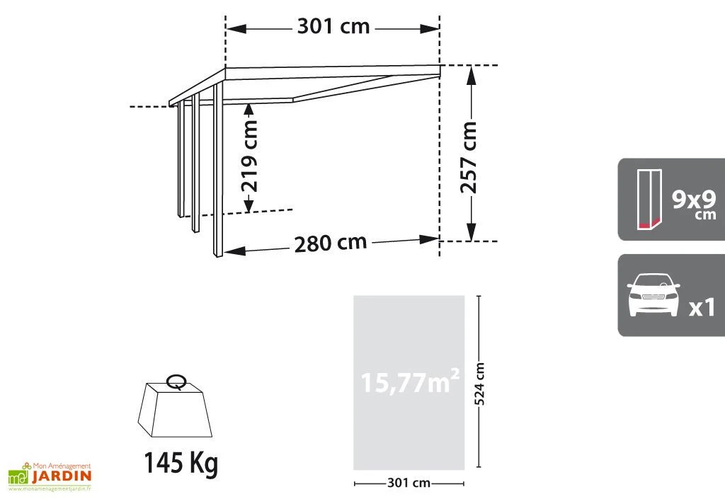 Le carport est constitué de poteaux de sections 90×90 mm. Il est livré avec la visserie et sans la couverture. Il supporte une charge de neige maximum de 20 kg/m2. Le carport a une largeur de passage de 2,80 m et une hauteur de passage de 2,19 m. Le carport est livré en kit, à monter facilement soi-même avec une notice de montage détaillée. Forest Style garantit votre carport 2 ans contre tout vice de fabrication.