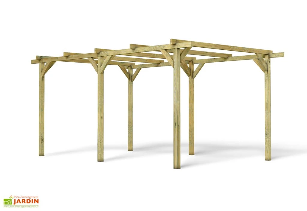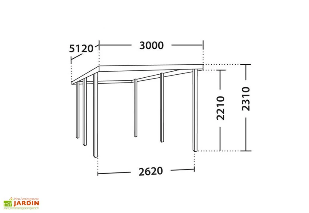 Ce carport en bois de pin sylvestre vous offre un espace destiné à accueillir votre voiture. Il vous servira de base que vous pouvez recouvrir de plaques de tôles en acier galvanisé ou de panneaux de polycarbonate. Son espace à l’intérieur des poteaux est de 13,4 m², avec des dimensions intérieures de 262 x 512 x 220 cm (I,L,H). Le carport est supporté par 6 poteaux de 9 x 9 cm de section.