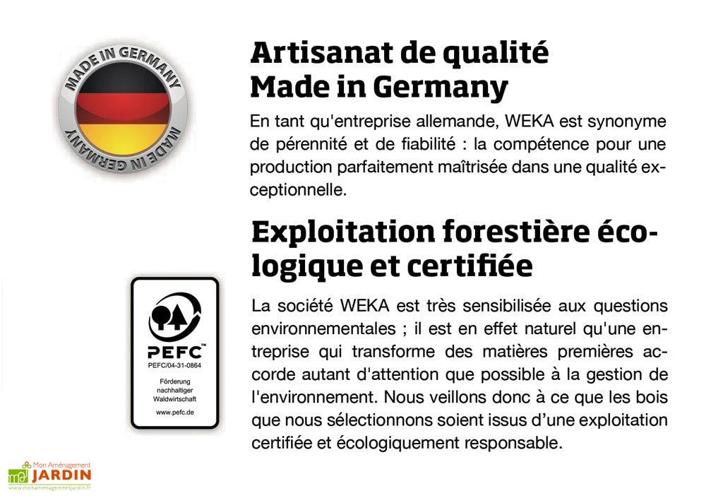 Votre carport PLUS de chez Weka est fabriqué en pin (FSC) imprégné en autoclave (IAC) qui lui garantira une bonne tenue dans le temps. Le carport est constitué d’un petit ou d’un grand local à outils a sélectionner en option. La section des poteaux est de 90×90 mm. Le toit du carport est en plastique de forme trapézoïdale. Il est fixé au moyen de vis de plombier avec rondelles de joint moulées et cales d’espacement qui évitent l’écrasement de la plaque sur la poutre. Le carport a une largeur de passage de 2,70 m de chaque coté et une hauteur de passage de 2,15 m. Le carport résiste a 125 Kg/m² de neige. Le carport Weka est livré en kit, à monter facilement soi-même avec une notice de montage détaillée sans accessoires (ancrage en H) ni décoration. Weka garantit votre carport 5 ans sur toutes les pièces en bois et 2 ans pour le reste. Le visuel présenté correspond au grand local à outil.