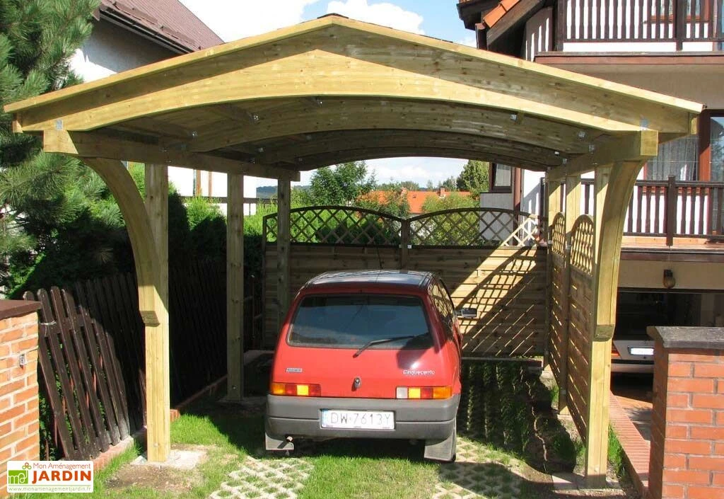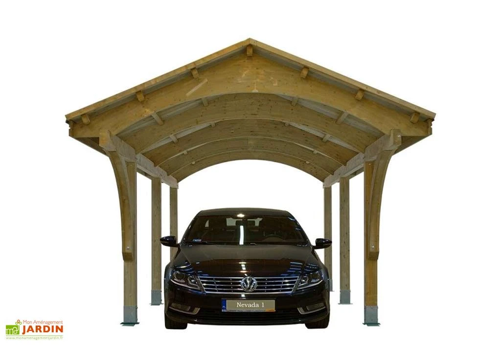 Le carport en bois Nevada en épicéa massif est traité autoclave. Le carport dispose de pièces arquées en lamellé collé. Les poteaux ont une section de 14 x 14 cm ce qui lui assure une grande robustesse.