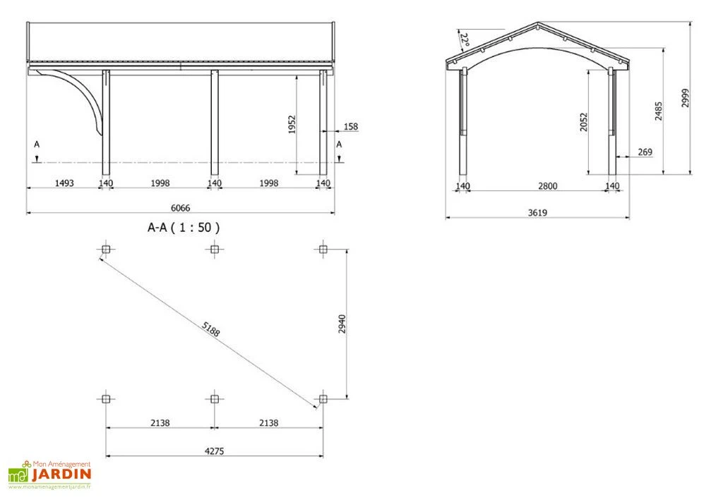 Le carport 1 voiture mesure 361 x 606 x 299 cm (l,l,h). Le bardeaux bitumé assure l’étanchéité, il est disponible en vert ou noir.