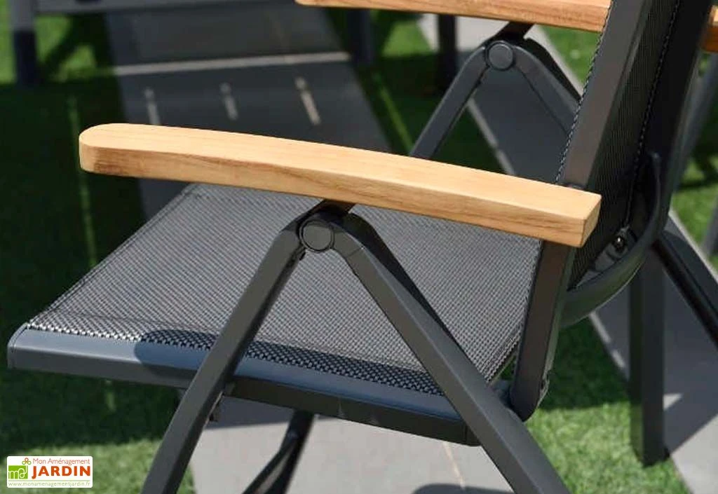 Cette chaise de jardin pliante est dotée d’une structure en aluminium, un matériau souvent privilégié pour le mobilier d’extérieur car naturellement insensible à la corrosion. L’assise et le dossier sont pour leur part conçus en polyester tandis que les accoudoirs sont faits de teck, un bois résistant aux intempéries, même sans traitement.