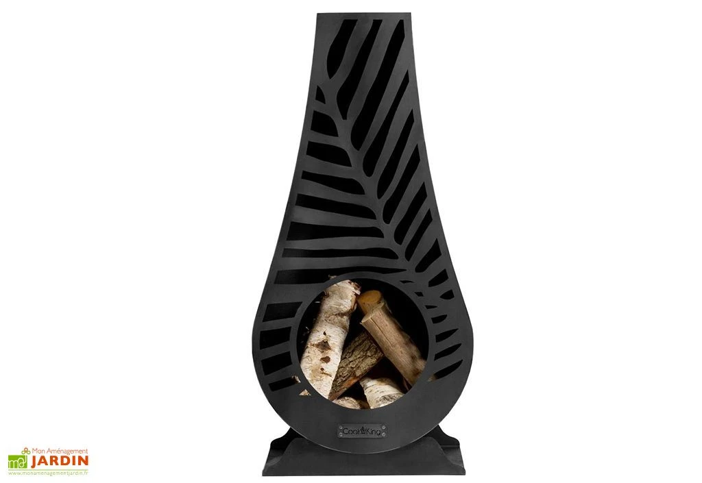 La cheminée mesure 50 cm de long par 33 cm de large et 108 cm de haut et présente un design contemporain avec un motif feuille pour s’harmoniser avec le jardin.