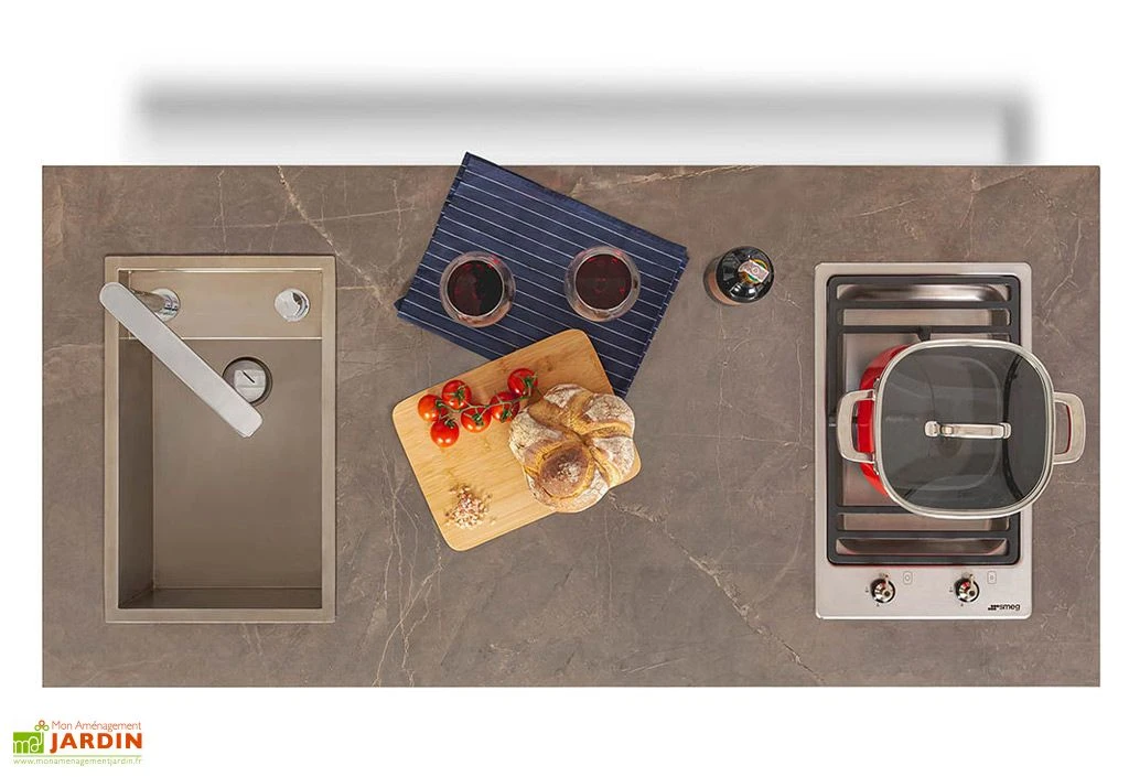 Cette cuisine d’été fonctionnelle comporte une plaque de cuisson à gaz de la marque SMEG à 1 feu ainsi qu’un évier Cana HV330 en acier inoxydable. Ce dernier est équipé d’une robinetterie moderne ainsi que d’un mitigeur et d’un système d’évacuation standard. Le tablier revêt une très belle couleur marron et vous offre un espace assez grand pour travailler confortablement. Ce plan de travail est en céramique et résistera face à l’abrasion, aux impacts et aux rayures. Cette cuisine s’intégrera facilement dans votre espace extérieur grâce à ses lignes épurées et sobres.