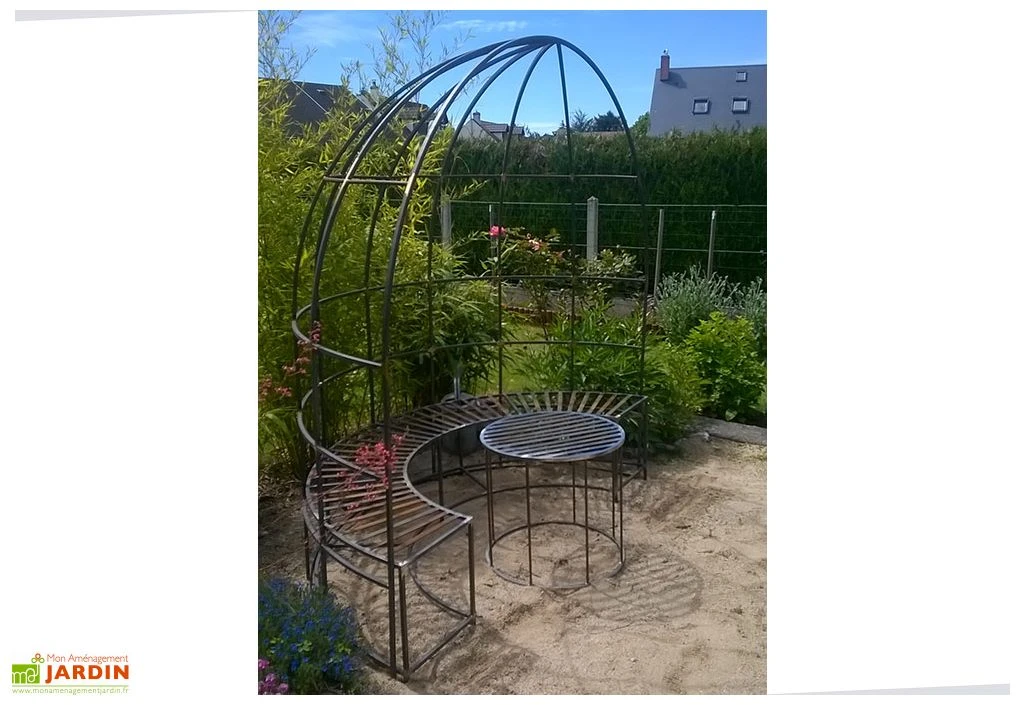Ce demi-cercle avec banc et table de jardin est entièrement composé de fer, que vous pouvez choisir brut pour le laisser rouiller naturellement et obtenir un rendu avec beaucoup de cachet. Ou alors vous pourrez choisir un revêtement en peinture époxy, dont la pose est réalisée au pistolet. Le choix du coloris s’effectue dans les options.
