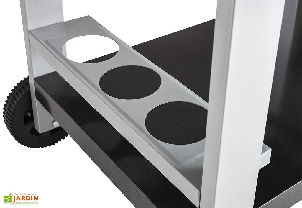 La structure de la desserte ainsi que le plan de travail sont en acier epoxy. Elle dispose d’un porte ustensiles et d’un porte bouteilles. Pour faciliter le déplacement, la desserte possède deux roues renforcées et une poignée. Le poids maximum supporté par la tablette haute est de 50 kg, et 25 kg pour la tablette basse.