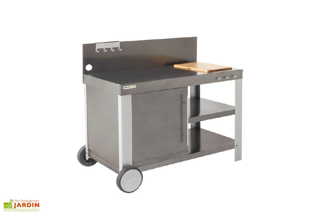 La desserte de chez Cook’in Garden mesure 65 cm de longueur, 122 cm de largeur et 105 cm de hauteur. Elle vous servira de plan de travail ou de table pour poser votre plancha. La surface de travail mesure 55 cm de longueur et 110 cm de largeur. La desserte dispose d’une crédence avec porte-ustensiles amovible.