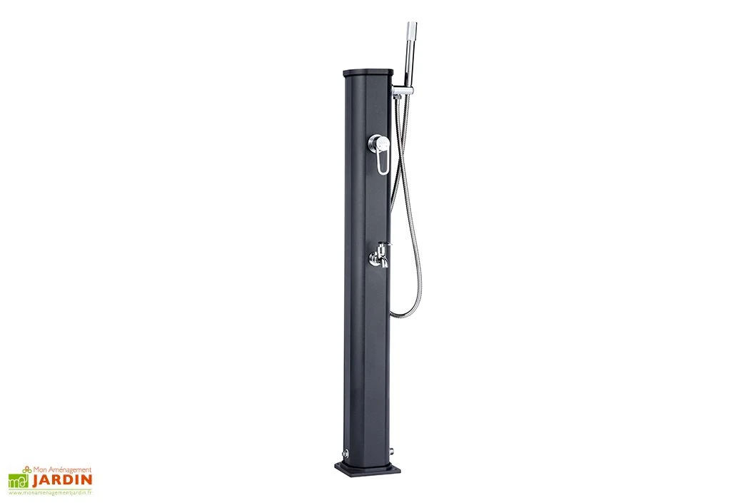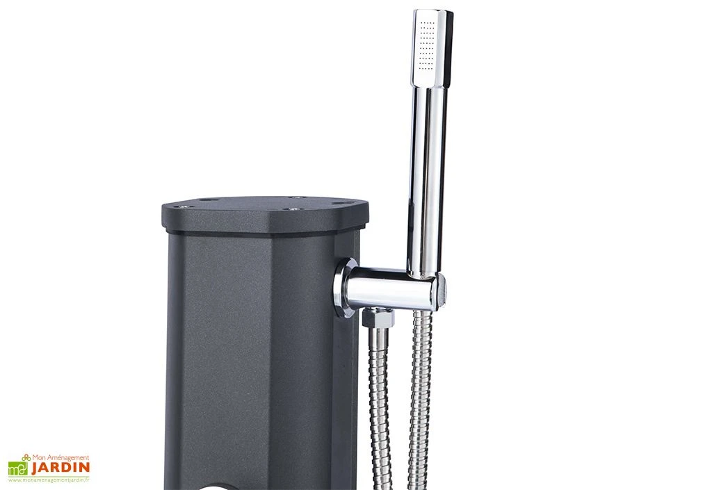 Parfaite pour l’avant ou l’après baignade, cette douche de jardin est dotée d’un flexible avec douchette vous permettant de vous rincer le corps sans avoir à vous mouiller les cheveux. Elle dispose également d’un robinet, pour le rinçage des pieds, et d’un mitigeur grâce auquel vous pourrez régler facilement la température de l’eau.