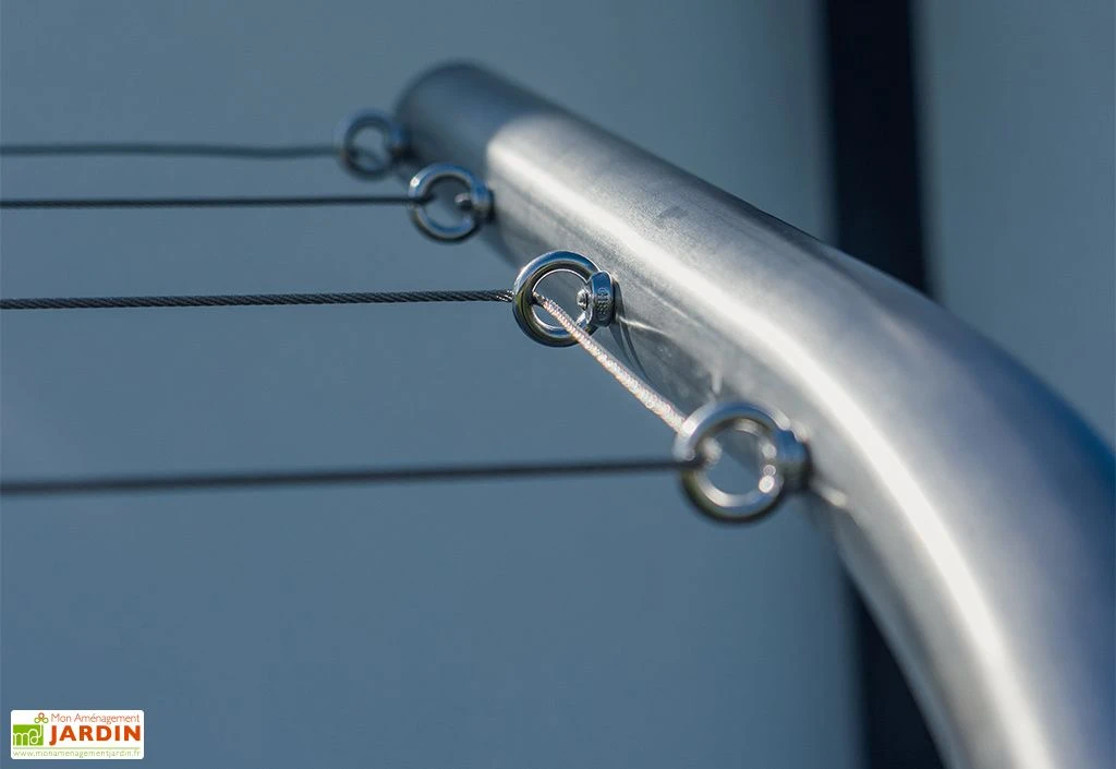 Le câble en inox, d’une longueur de 25 mètres, possède un large diamètre de 3 mm pour une solidité accrue. Ce câble passe librement dans les anneaux de part et d’autre des poteaux pour pouvoir répartir la tension automatiquement et uniformément sur toute la structure. Un tendeur en inox de chaque côté vient ensuite assurer la tension du câble manuellement afin d’affiner le réglage.