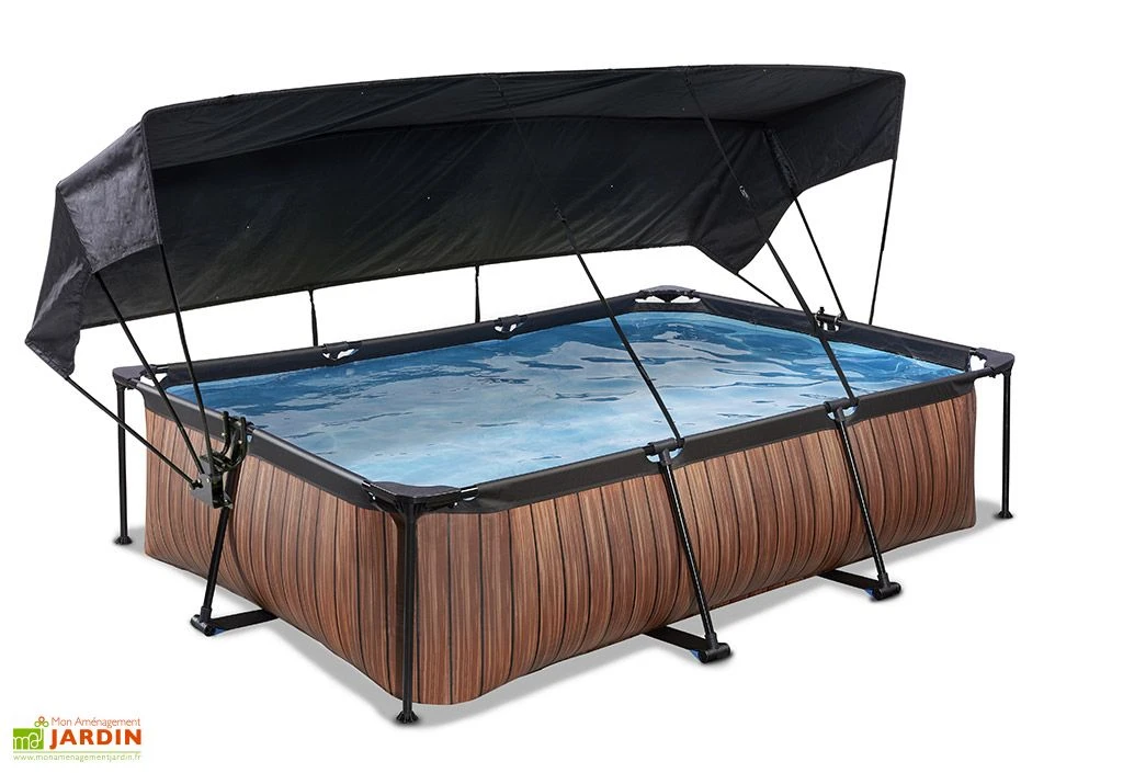 L’auvent comprend une structure en acier galvanisé et une toile noire qui mixe le polyester et le polyuréthane. Son système d’éventail permet de couvrir partiellement ou totalement la piscine pour que les enfants puissent se baigner en restant parfaitement protégés. Des sangles réglables permettent d’ajuster et de fixer facilement le voile d’ombrage.