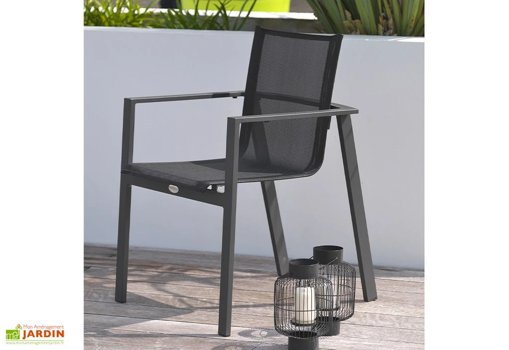 Le fauteuil de chez DCB Garden a une armature en aluminium et une assise en textilène noir. Le fauteuil mesure 58 x 58 x 84 cm (l,l,h). La hauteur de l’assise est de 43 cm. La garantie est de 2 ans.
