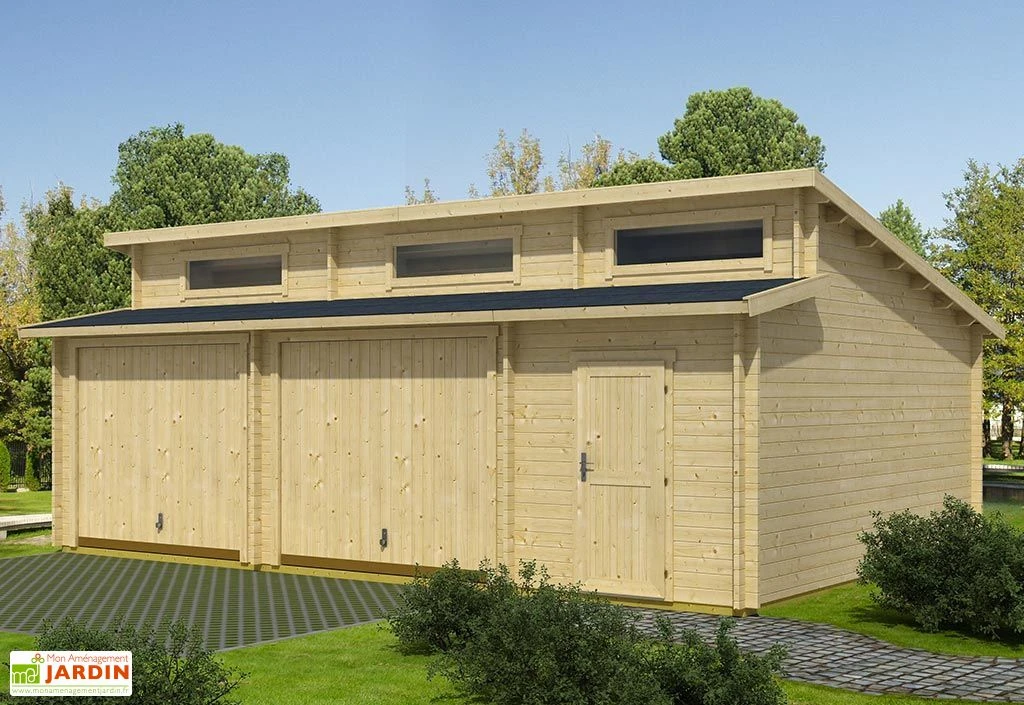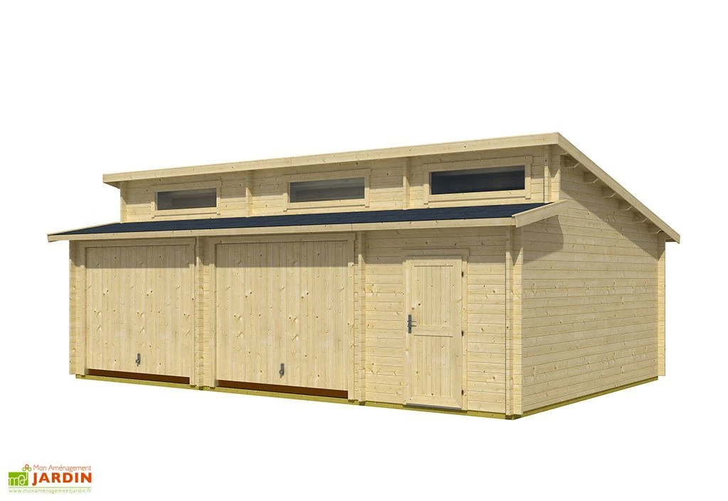 Ce grand garage est fabriqué en épicéa massif. Ses parois de 44 mm d’épaisseur supportent une toiture en pente couverte par un revêtement en toile bitumée. Ce garage en bois est également doté de trois fenêtres simple vitrage en verre trempé de 150 x 41 cm disposées au-dessus de chacune des portes afin de faire profiter l’intérieur d’un peu de luminosité. Livré en kit, ce garage devra être monté par vos soins.