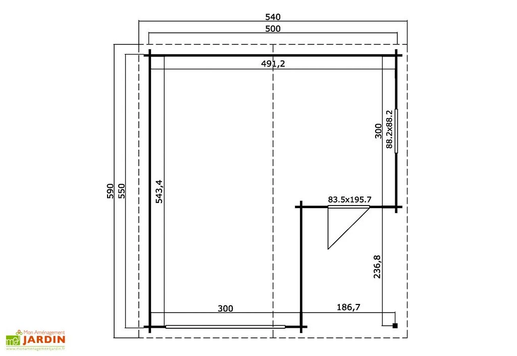 - Dimensions hors tout : 540 x 590 cm x 31,8 m²