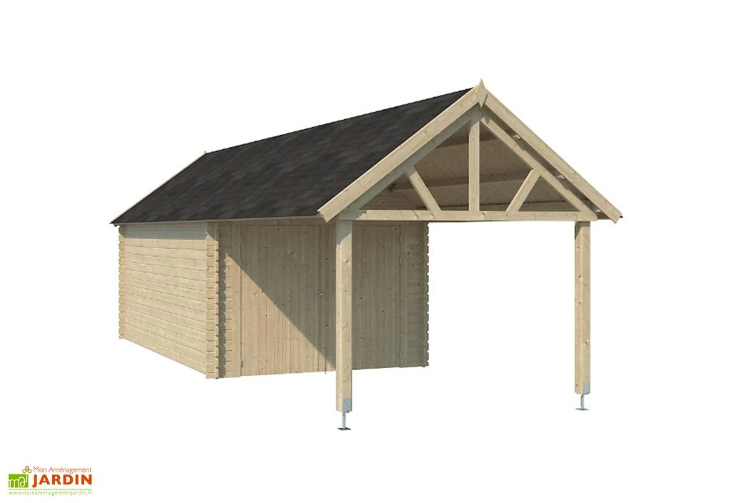 Les cloisons de ce garage en bois et les poteaux de la partie auvent supportent une toiture à deux pans couverte de shingle dont vous pourrez choisir le coloris. Outre son côté esthétique, le revêtement en shingle permet d’assurer la bonne étanchéité du toit. Notez enfin que tout le bois utilisé pour concevoir ce garage est certifié PEFC, ce qui signifie qu’il provient de forêts gérées de manière écologique.