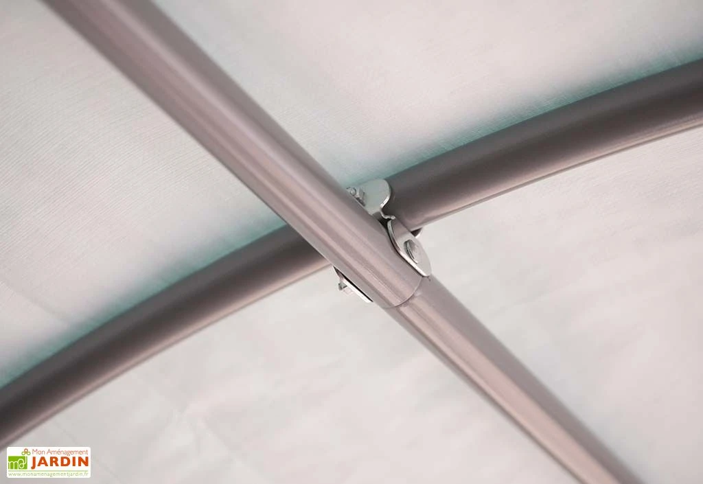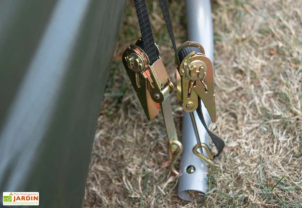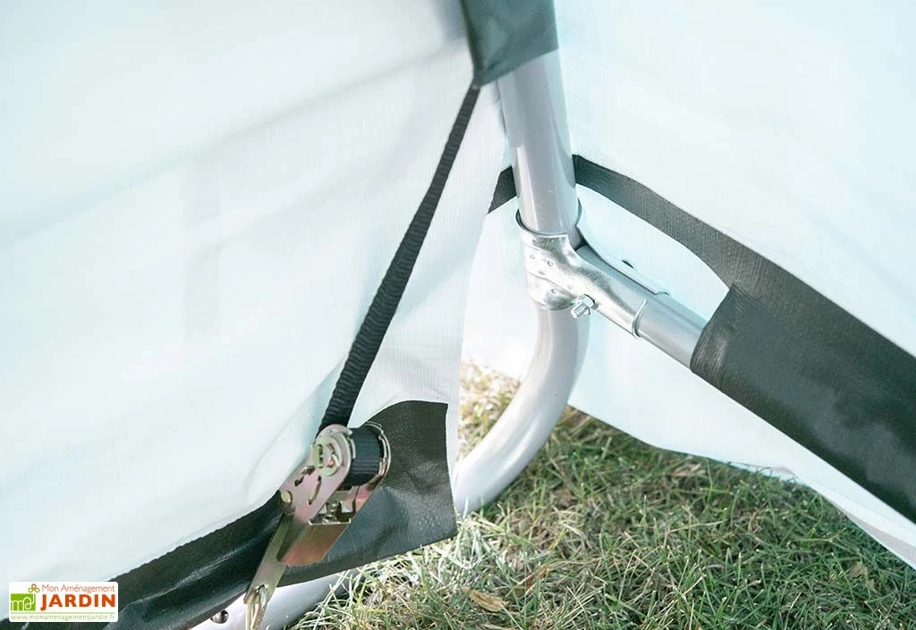 La bâche qui équipe ce garage souple est soutenue par une structure en acier de 3,5 cm d’épaisseur traitée de sorte à ne pas craindre la rouille. L’ensemble témoignera donc d’une belle résistance face aux agressions extérieures et ne vous demandera aucun entretien particulier. La fixation de la bâche à l’armature se fera grâce aux huit sangles d’arrimage également incluses.