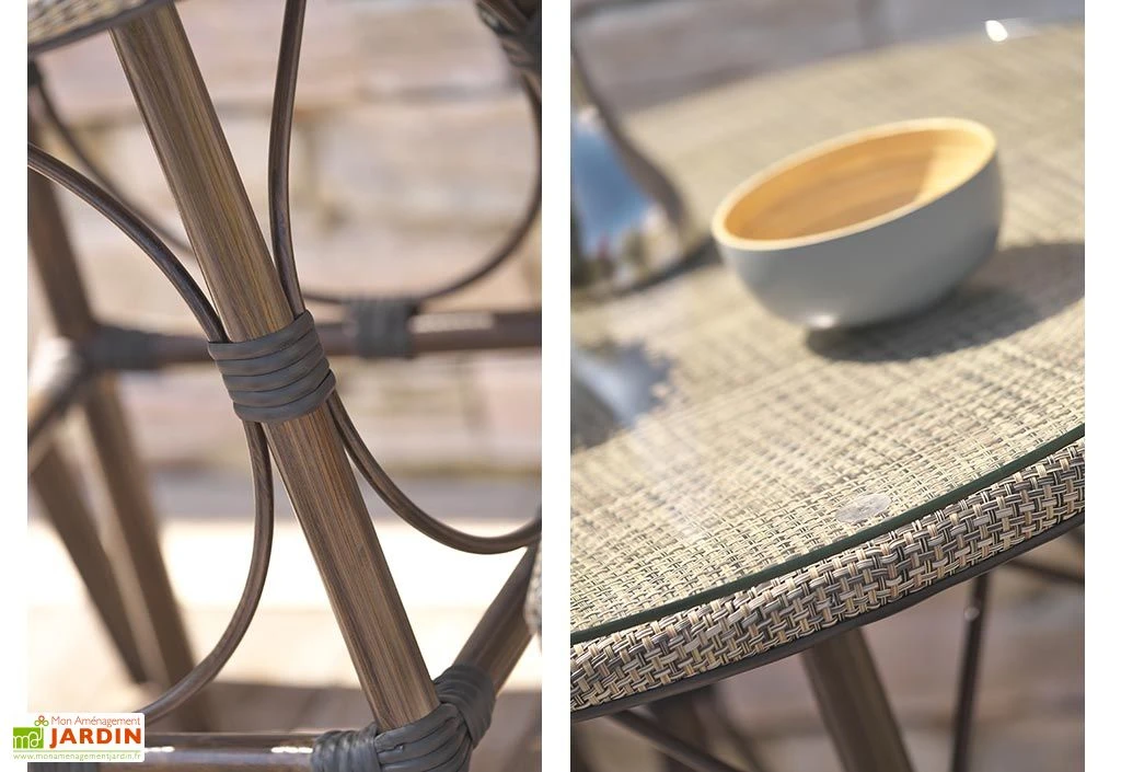 Ce guéridon possède un plateau d’un diamètre de 70cm et une hauteur de 74 cm. Il est composé d’une structure en aluminium marron imitant le bambou. Son plateau se compose de textilène coloris lin recouvert de verre.
