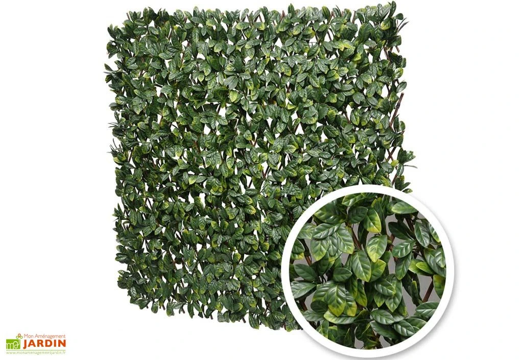 Le treillis extensible est composé d’une structure en bois de saule rigide. Les feuilles sont en polyéthylène, disposées sur l’une des faces du treillis. On en compte environ 1000 pour un panneau de 200 x 100 cm. Le panneau possède une épaisseur de 35 mm. Vous pouvez ainsi vous en servir comme brise-vue ou comme décoration extérieure ou intérieure pour dissimuler un mur par exemple.