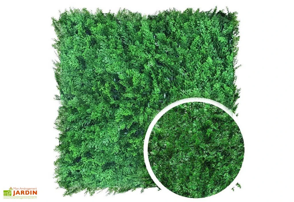 Cette haie artificielle de chez France Green mesure 1 x 1 m (longueur, largeur), soit 1 m². Elle imite à la perfection le thuya fraîchement tondu. Ce feuillage fabriqué à 100 % en polyéthylène repose sur une face simple en plastique. Cette face est composée de 4 plaques de 25 x 25 cm (longueur, largeur) clipsées entre elles.