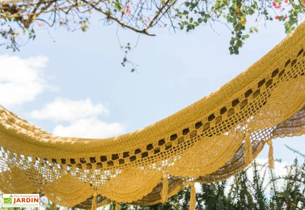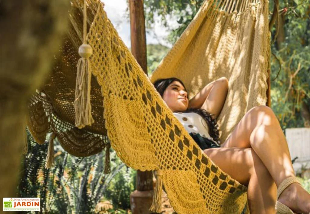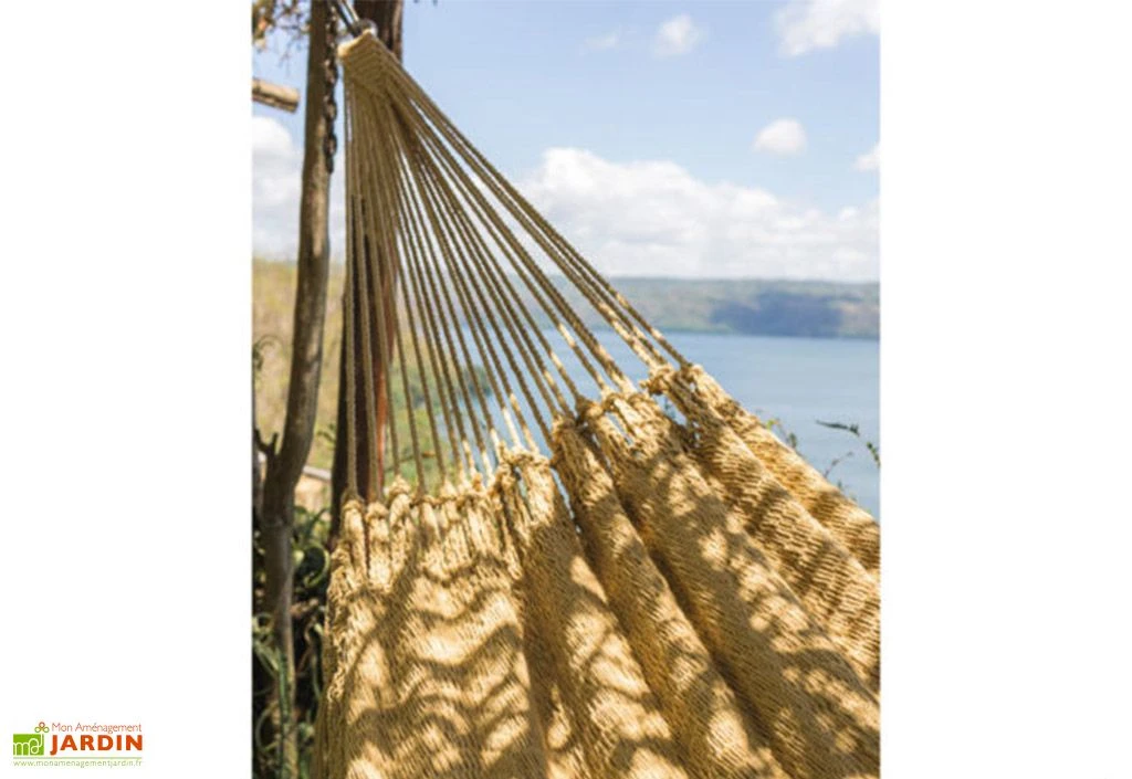 Le hamac Santiago XL de chez Hamac del Sol est à la fois spacieux, robuste et confortable. Tissé à la main suivant la tradition nicaraguayenne, il possède une toile pouvant atteindre les 2 m de large une fois étirée, pour 2,37 m de long (longueur totale : 4 m), ce qui en fait un véritable hamac double !