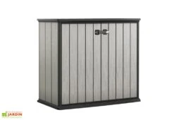 Ce coffre de jardin multifonctions de la marque Keter offre une capacité de stockage de 2000 L. Il affiche en effet des dimensions intérieures de 164 x 97 x 127 cm tout en n’occupant que 2 m² dans votre jardin. Sa double porte de 151,5 x 127 cm et son couvercle monté sur vérins vous permettront de stocker en toute simplicité des équipements relativement encombrants comme du matériel de jardinage, un système de filtration pour piscine ou encore des vélos, par exemple. Notez que ce coffre d’extérieur pourra également faire office de cache poubelle.