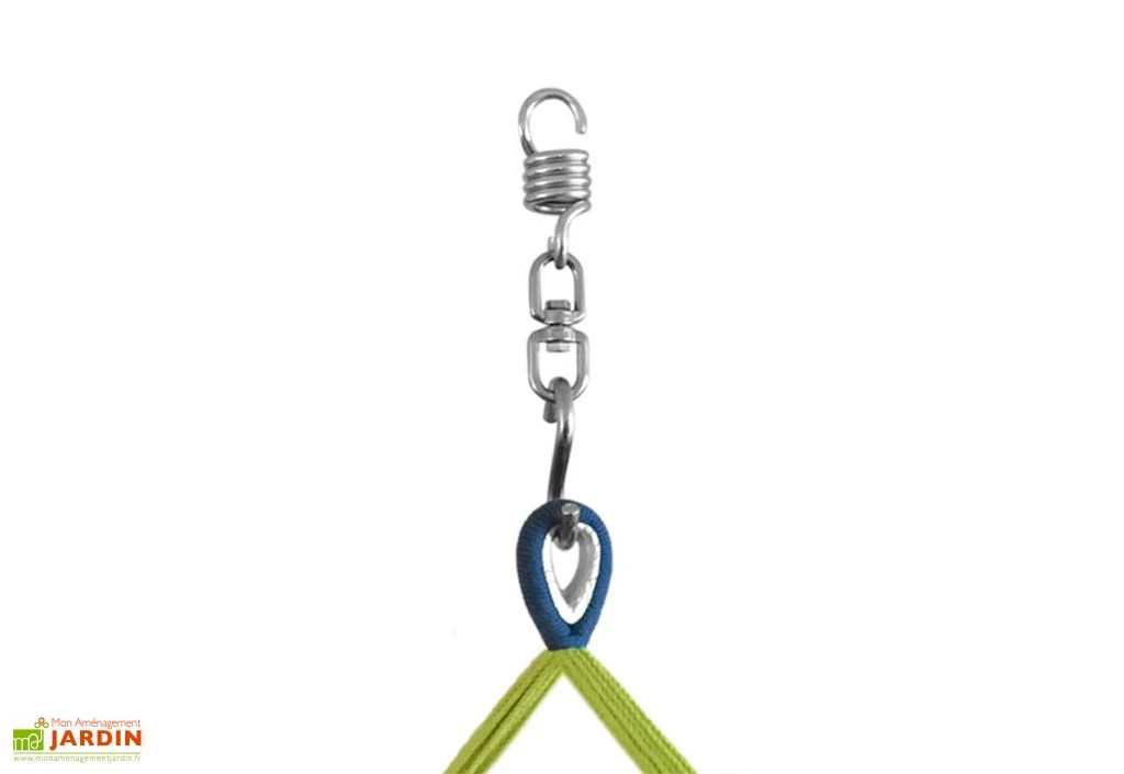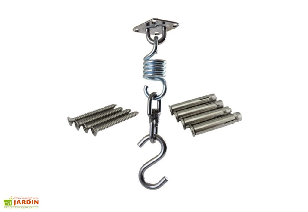 Ce kit de fixation vous permettra d’accrocher votre chaise suspendue Hamac del Sol à un plafond en béton ou à une poutre, par exemple. Il comprend une plaque en losange, un ressort, un émerillon, un crochet en S ainsi que quatre vis béton et quatre vis à bois, le tout conçu en acier inoxydable. Ce système de suspension pourra donc rester en extérieur sans craindre les intempéries, ni la rouille.