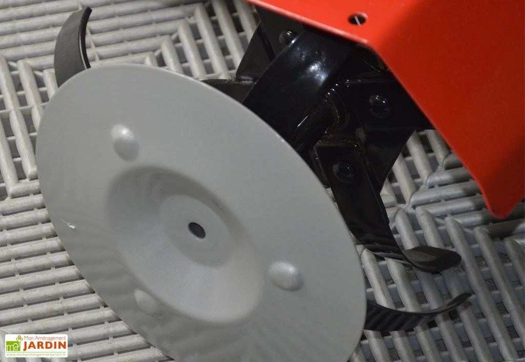La motobineuse thermique de 139 cc dispose d’un moteur OHV 4 temps. La motobineuse possède 6 fraises pour une largeur de travail maximale de 59 cm et une profondeur de 26 cm. La motobineuse dispose d’un réservoir d’essence de 1,6 L et d’huile de 0,55 L. Avec son guidon large, ses poignées et sa roue avant, le transport de l’appareil sera facilité. Il est équipé de caches en métal pour la protection des fleurs. La garantie est de 2 ans.