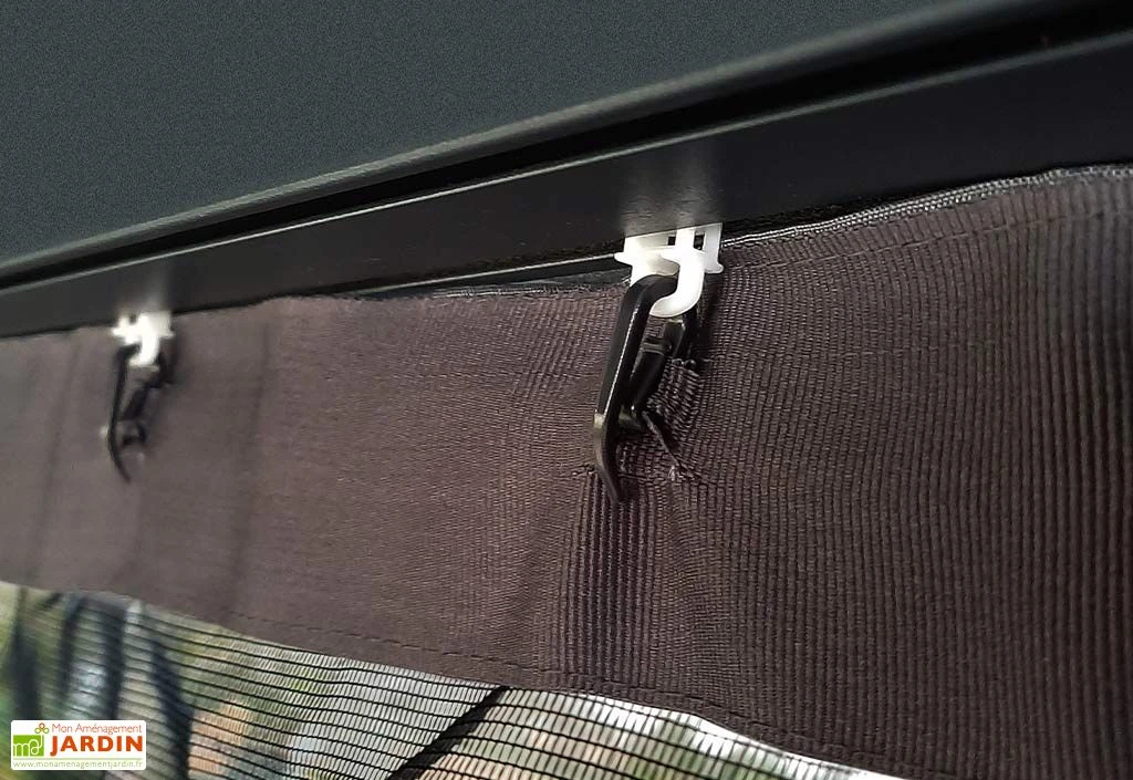 Les moustiquaires en polyester se fixent sur la pergola Dallas de Palram-Canopia. Faciles à installer, il suffit de clipser les crochets inclus dans les rails de la pergola puis d’attacher les moustiquaires à ces crochets. Elles glissent ensuite aisément dans les rails.