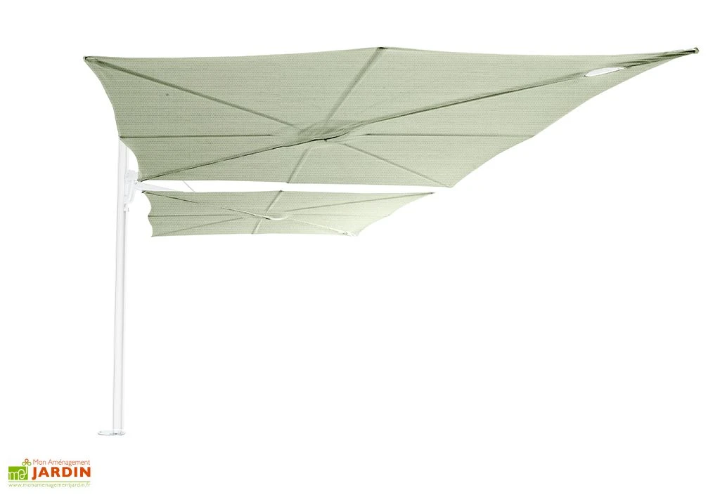 Ce parasol double disposent de 2 poteaux de 260 cm de hauteur qui offrent une hauteur sous toile confortable de 197 cm. Sa longueur totale est de 540 cm pour une largeur totale de 285 cm et deux toiles de 250 x 250 cm. Une fois repliée les toiles viennent se plaquer contre les poteaux pour prendre peu de place.
