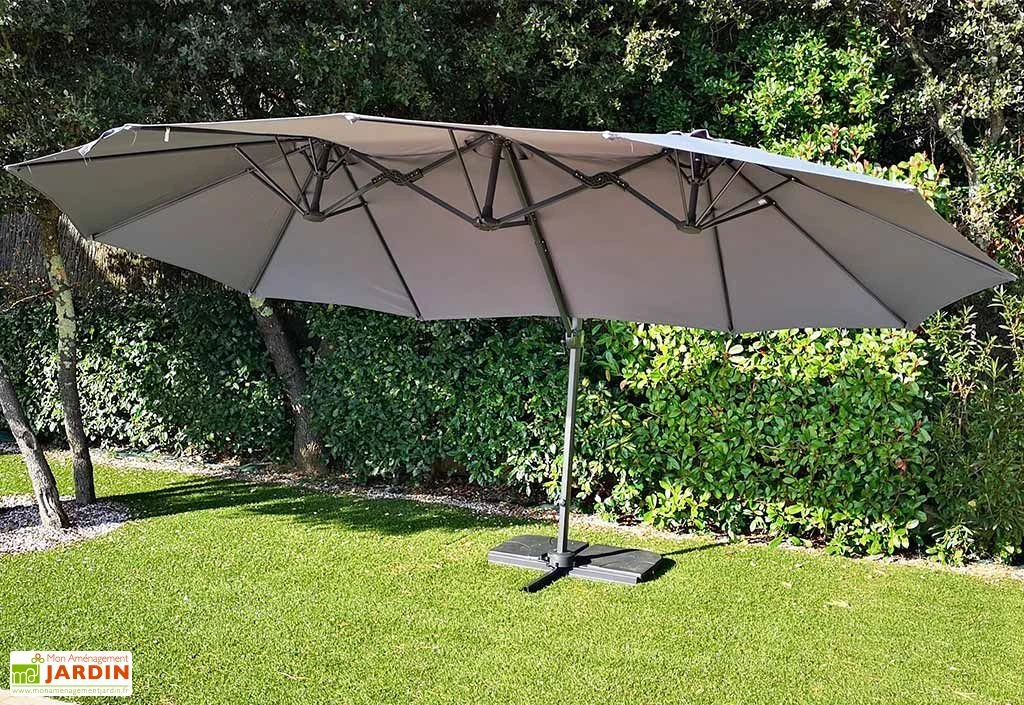 Le parasol bénéficie d’une très grande dimension permettant de couvrir un grand salon de jardin par exemple. Il est déporté et dispose d’une platine tournante à 360° permettant de suivre la course du soleil tout au long de la journée. Cette grande toile est supportée par 3 têtes équipées de 12 baleines de 12 x 18 mm de section.